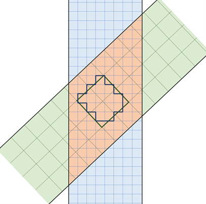 Figure 2: Illustration of spatial resampling in satellite matchups. The orange region shows collocated observations, with swaths from a lower resolution (green) and higher resolution (blue) satellite. Thick dark green and blue lines represent the lower-resolution sensor’s comparison field-of-view and the higher-resolution sensor’s reconstruction, respectively.