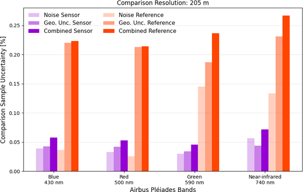 Figure 4: Uncertainty components for spatially resampled Sentinel-2 (target) and TRUTHS (reference) simulated radiances over a Libyan desert scene, derived from similar Pléiades spectral bands. Combined uncertainty is obtained by combining noise and geolocation uncertainties in quadrature.