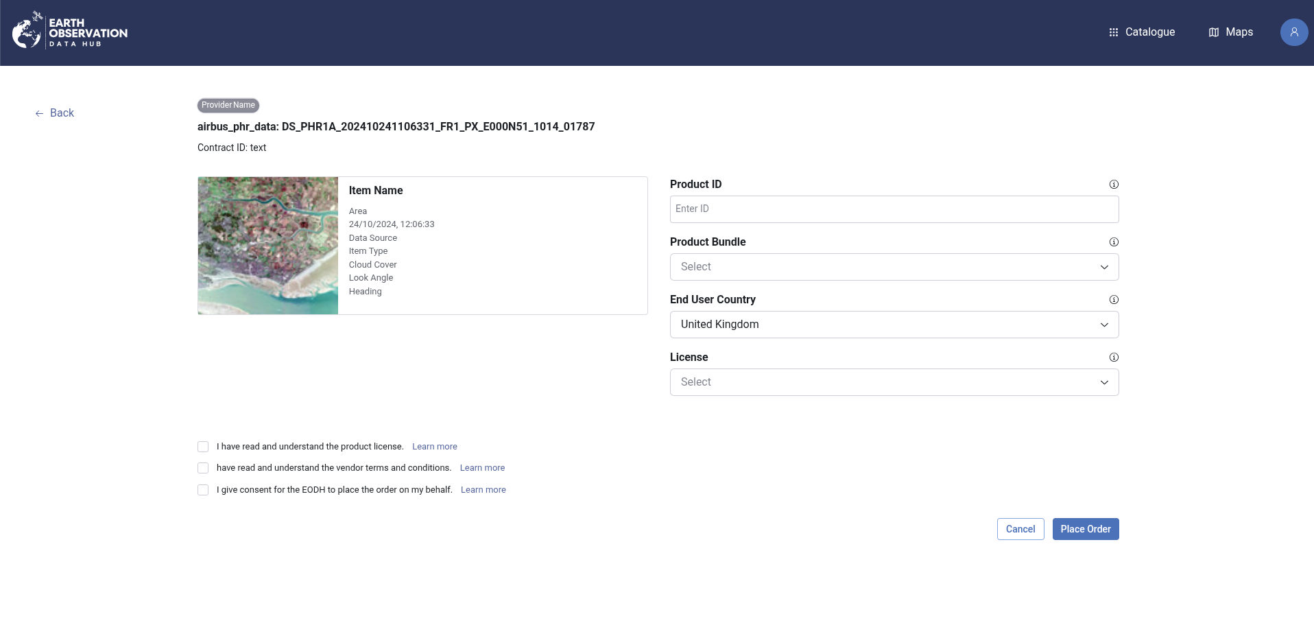 To carry out the purchase, review all of the fields displayed and check you are happy with all elements of the order, as a purchase cannot be reversed once it has been made. If you have any queries before carrying out the order, don’t hesitate to get in contact with enquiries@eodatahub.org.uk where the team will be happy to assist you. Follow the guidance below, which walks through the requirements for each field, step by step.